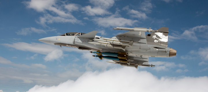 如图军事爱好者一眼就能认出来的的“JAS 39“Gripen(鹰狮)”,萨博出品。上学期一门课上老师就请来SAAB某部门的director来给我们讲Gripen的Fault tolerant system。