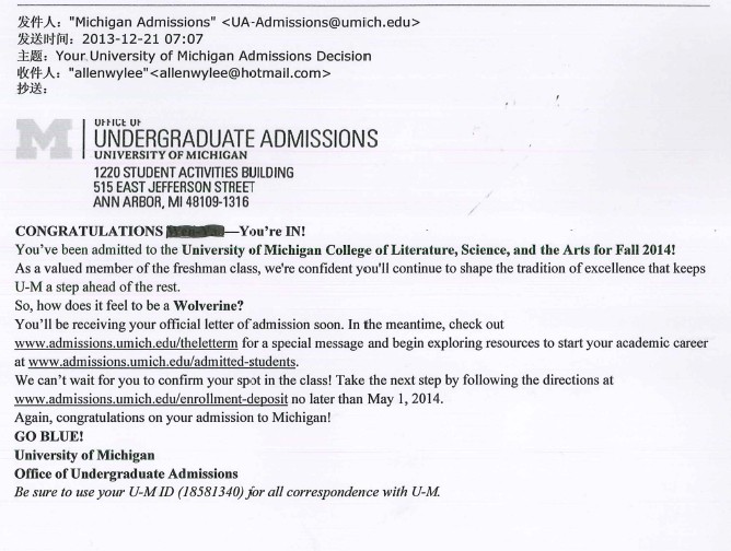 周一上班,打开邮件,让我振奋的消息来临:李同学 密歇根安娜堡本科生物专业录取。