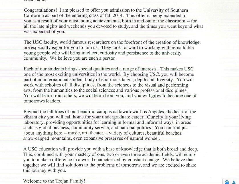 最终学生确定入读南加大;南加大转学出结果很晚 在今年五月底才获得录取消息。五月底凌晨三点获得学校录取通知,晚上学生 学生父母 我 启德文案冷老师 几乎都是兴奋了一晚上,这个录取来的太好了,学生一直都梦想继续留在加州,最想去的也是南加大,当时申请到加州州立北岭分校是孙同学自己DIY申请的,当时的托福成绩并不差,因为信息了解的不全面 文书制作不够合理,最终只去了加州州立北岭,为此孙同学一直有转学的梦想,谢谢孙同学及家人对我及我的团队工作的信任,如愿以偿,好事多磨。相信你以后有更好的发展前景的。