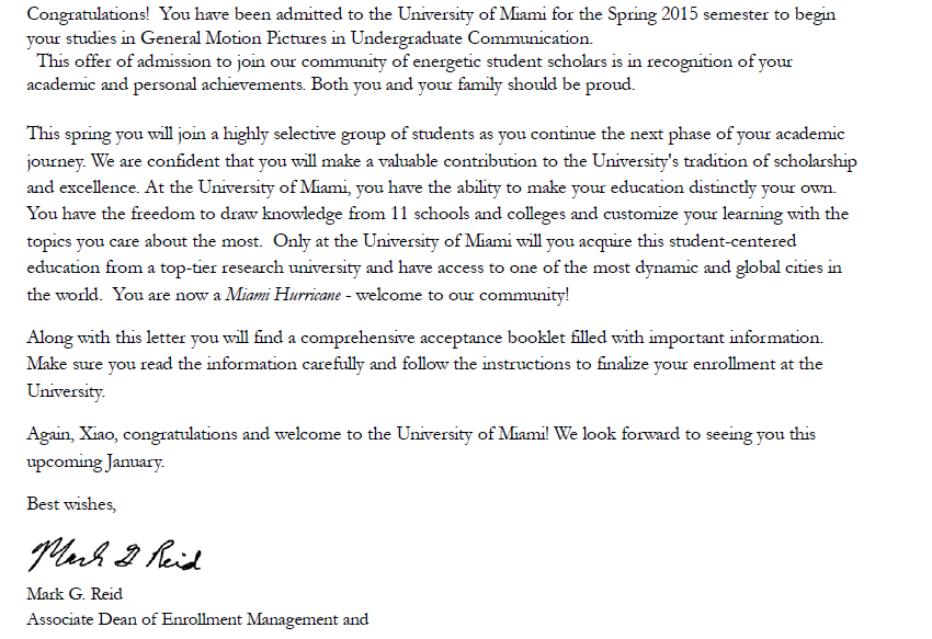 恭喜吕同学转学获得排名前50迈阿密大学的录取