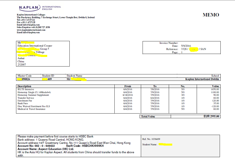 W同学选择去爱尔兰读了4周的纯语言课程。下图为他的花费一览以及学习周期。包括学费、保险费和其他杂费算在内,共计2995欧元。后来,学生和我们反馈说,爱尔兰太好了。他爱上了那里,不想回来了。他还提到,那里的花费的确不高。另外,如果在读语言课程的间隙,再代购几单,那么会节省更多的花销哦。既达到了短期学习的目的,又合理地分配开销。