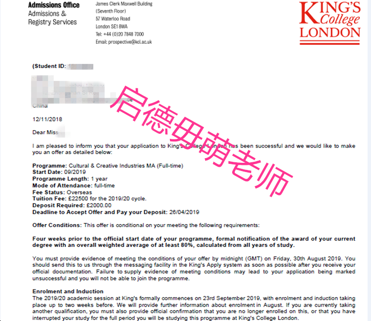 在申请季到来的时候,按照学校的要求以及学生的综合表现,文书老师撰写了非常出彩的文书以及精心的辅导了学校的面试,很快KCL,曼大,华威等世界排名前50的学校来到了录取,由于伦敦艺术氛围浓厚,学生也很快确定了入读KCL伦敦国王学院这所大学。由于KCL在申请的时候需要提供2000字的writing