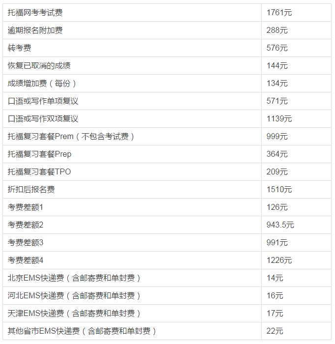 托福考试中涉及到的考试费包括:托福考试报名费、托福网考考试费、托福转考费、恢复已取消的成绩费、成绩赠送费、托福退考费、逾期报名附加费、口语或写作单项复议费、托福复习套餐购买费用等。