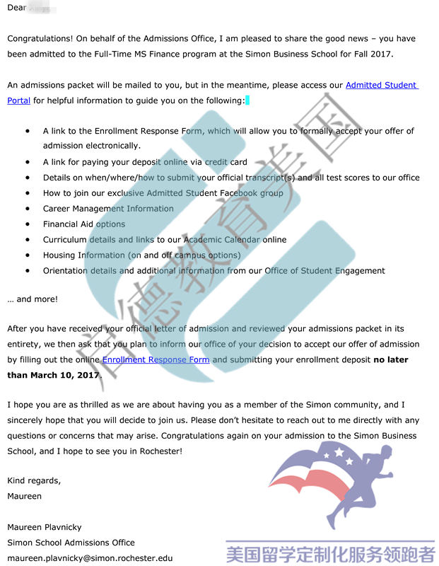 学生的dream school是去罗彻斯特Simon商学院,在给她推荐选校时,也根据她的目标院校以及地理位置、综合排名、专业排名、就业环境等等进行了推荐。当时为了在10月提交早申那批,学生先把650的GMAT给递上去了,后面学生陆续在收offer,就没有再继续考了。学生申请金融,面试也比较多,所以我一直在积极跟学生做准备,找面经,加上学生的口语能力本身就不错,所以最后全程也进行的比较顺利。目前已获得专排TOP15的罗彻斯特大学offer,专排TOP20的福特汉姆大学、东北大学、乔治华盛顿大学、康涅狄格大学、马里兰大学帕克分校、德雷塞尔大学的offer,剩下的目前还在等结果,估计按这个形势,要拿大满贯了。