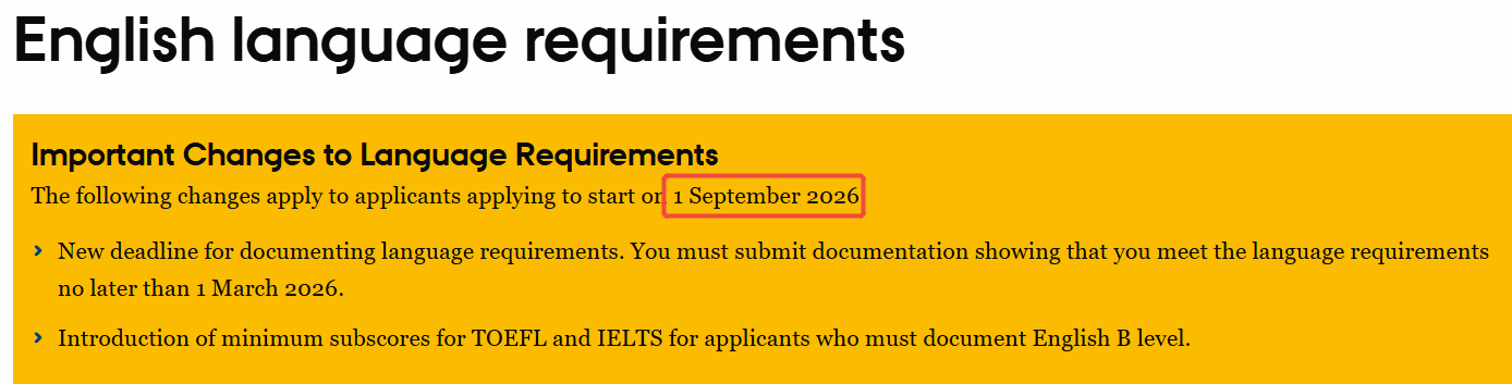 【丹麦】ArhusUniversity奥胡斯大学官宣了2026年秋季入学的语言要求变化,至此丹麦排名前三院校今年都提高了语言要求,丹麦秋季入学申请时间和语言要求总结如下: