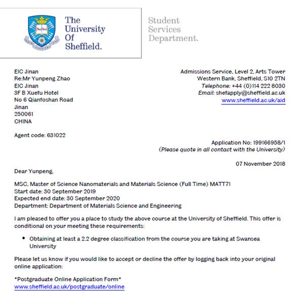 顾问点评:学生在国内对于他自己的本专业物理还没有产生浓厚的兴趣所以成绩并不是很突出,去到英国斯旺西大学后,非常适应英国的学习和生活的方式,对于自己的专业随之也产生了浓厚的兴趣,目前已经完成了在英国大学第一年的学业,取得了非常优异的成绩一等学位。由于物理专业相对来讲开设的学校比较有限,根据跟学生的深入交流之后,结合着李老师之前的申请经验,给学生推荐了跟物理结合比较紧密的材料化学方向的专业,因为此专业研究的是纳米技术,这是一个非常有就业前景的专业,学生也非常认可因为他本科的专业里面学过不少材料方面的课程,成绩也都很优秀,说明学生对这个方向是比较感兴趣,而且是有研究能力的。另外李老师挖掘到此学生还有未来深造读博士的的打算,关于博士的研究方向纳米方向的课题是非常多的,属于这几年的热门学科。在和学生达成申请谢菲尔德大学的这个专业后,我们又给学生做了头脑风暴深入挖掘了学生本科专业物理和目前准备申请专业纳米材料之间的一些关联性,例如物理学偏向研究“为什么”,就是自然界为什么会有这些现象,以及如何给出数学描述,而材料学更偏向“怎么用”物理告诉我们的是理论而材料学是想办法应用这些特质。通过文书里这些阐述我们最终为Z同学拿到了谢菲尔德大学的纳米材料与材料科学专业的offer,而且学校还给Z同学满足了递交雅思成绩的条件(正常是要在英语系国家学习时长满3年才可以豁免雅思,而Z同学在英国学习时间只有两年)