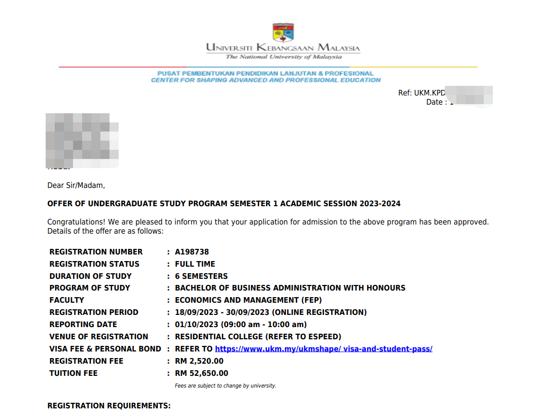4、录取院校:马来西亚国民大学 工商管理专业 本科录取