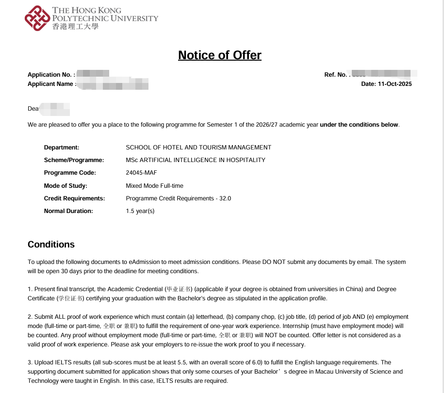 录取院校:香港理工大学 酒店人工智能硕士专业录取