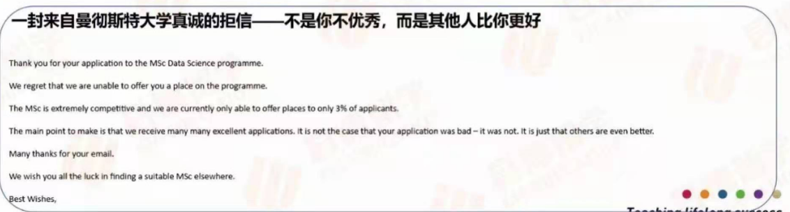 曼大市场营销专业一年只招生98人 录取率6% 金融只招生60人 录取率4% MSc 3%…曼大的拒信理由:不是你不优秀,而是其他人比你更优秀!标化考试从不是我们唯一参考标准 曼大中国招生官曾说 每年我们见到的雅思7.5、8分的学生不在少数 我们不缺优秀的学生 我们要的是最Top的学生🏻其他顶尖学校/企业 也是择最优录取 所以我们要做到人无我有人有我优!一定要把能做的到事情做到极致 不能做到的也要想办法找机会去尝试、去努力🏻