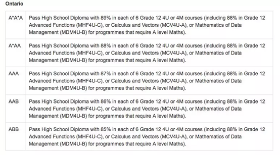 (2)本科面向安省高中学生录取学术要求:提供高中毕业证书OSSD;6门课的平均成绩;本科有要求A-Level数学成绩的专业可用OSSD 12年级任一数学课程(高等函数、微积分和向量或数据管理)的成绩替代。