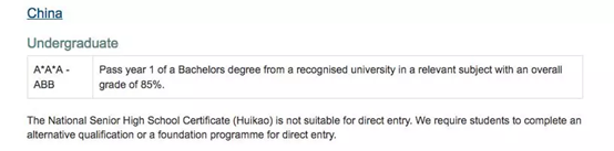 (1)本科面向中国高中学生的录取学术要求:会考成绩无法用于直接申请;学生必须参加预科学习或者完成其他学历证明。