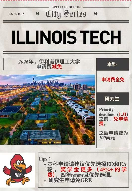 要申请2026秋季入学的宝子们,看这里,全美排名105(2024年usnews98)的伊利诺伊理工学院对本科生全部免申请费啦,如果选择本科提前批ED\EA入学的学生,奖学金将超过学费的45%,这将给留 查看详情>>