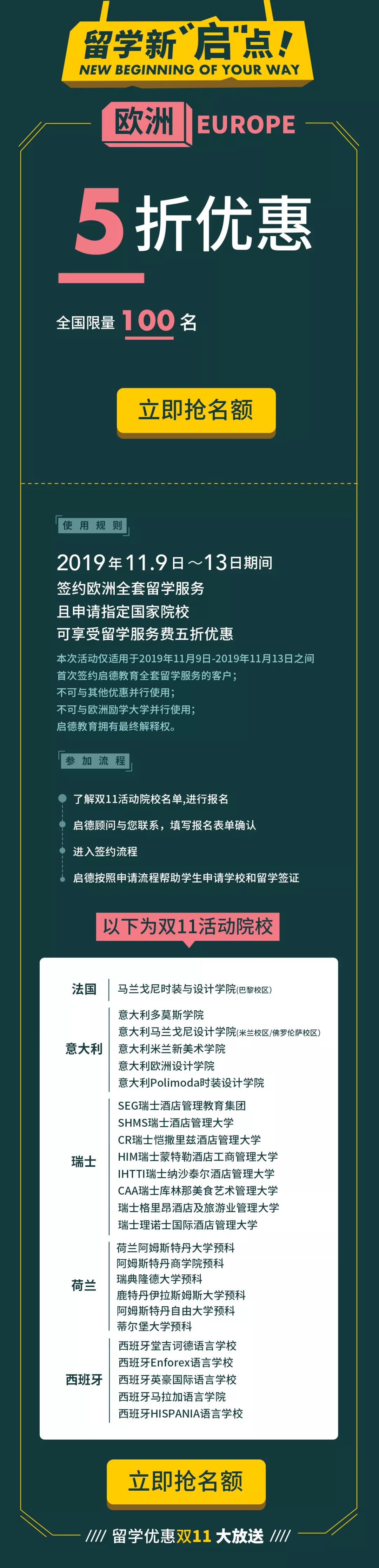 签约欧洲全套留学服务且申请指定国家院校,可享受留学服务费五折优惠