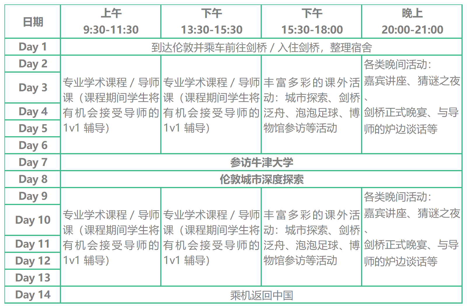 每周20 小时,两周合计 40 小时的学术时间,丰富的专业课程、导师课、主题实践工作坊。课后安排 1v1 学术辅导、特邀大咖前沿讲座以及丰富的文化、体育类活动,结识全球青年精英。以上为往期日程安排仅供参考,具体课程内容及课外活动根据学院不同将有所调整,以同学分配学院的最终安排为准,每个学院均为独立管理,鼓励同学积极参与本学院组织的晚间活动。