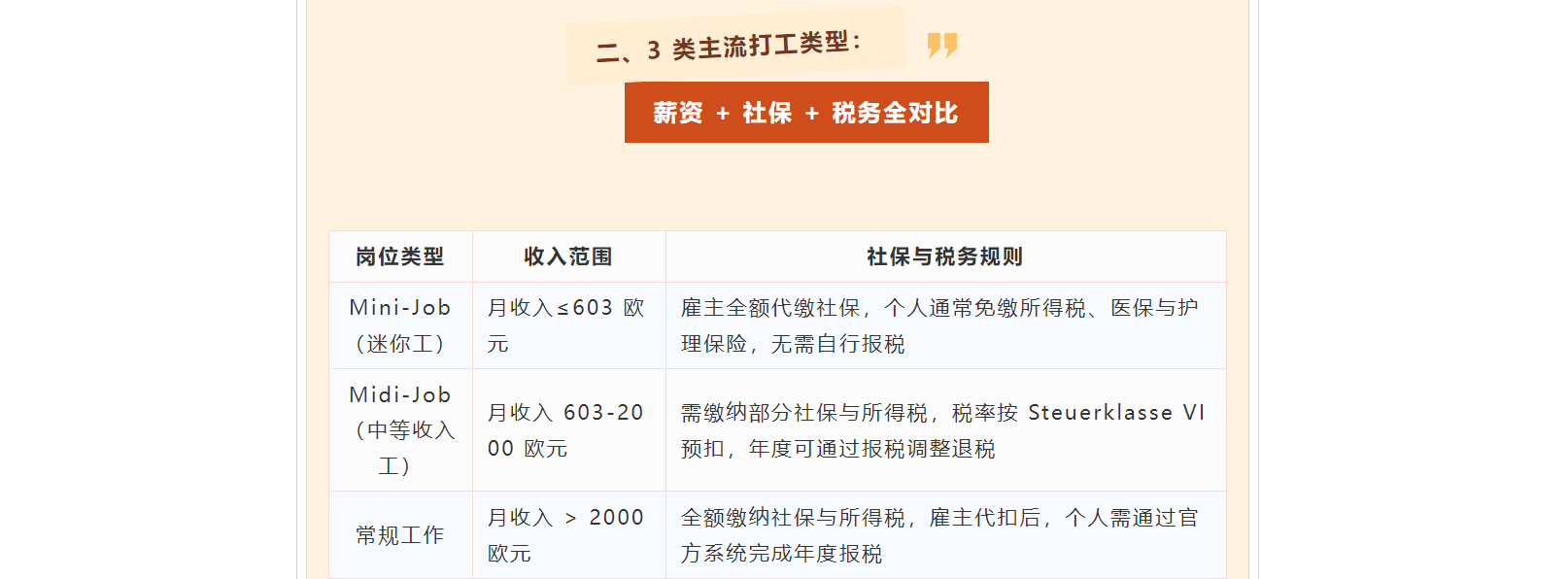 1. Mini-Job 月收入≤603 欧元,一般无需个人缴医保与护理保险;月收入超 520 欧元可能需缴纳医保与护理保险,具体以当地规定为准;