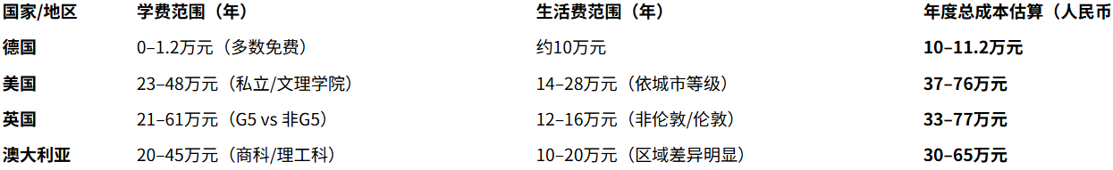 为便于横向比较,以下汇总四大主流留学目的地本科阶段年度总费用(学费+生活费)参考区间(按当前主流汇率粗略折算):