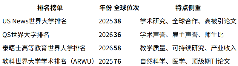 在2025年US News世界大学排名中,蒙纳士大学位列全球第38位,较往年稳中有升,是其在该榜单历史上的高位表现之一;在2026年QS世界大学排名中,该校以综合优势再获认可,排名全球第36位,凸显其在学术声誉、雇主评价及国际化程度等方面的突出表现;而在2026年泰晤士高等教育世界大学排名(THE)中,蒙纳士大学位居全球第58位,反映出其在教学、研究、知识转化与国际视野等维度的均衡发展;此外,在注重科研成果与学科精度的2025年软科世界大学学术排名(ARWU)中,该校排名全球第76位,尤其在临床医学、药学、工程学及计算机科学等领域具备显著优势。