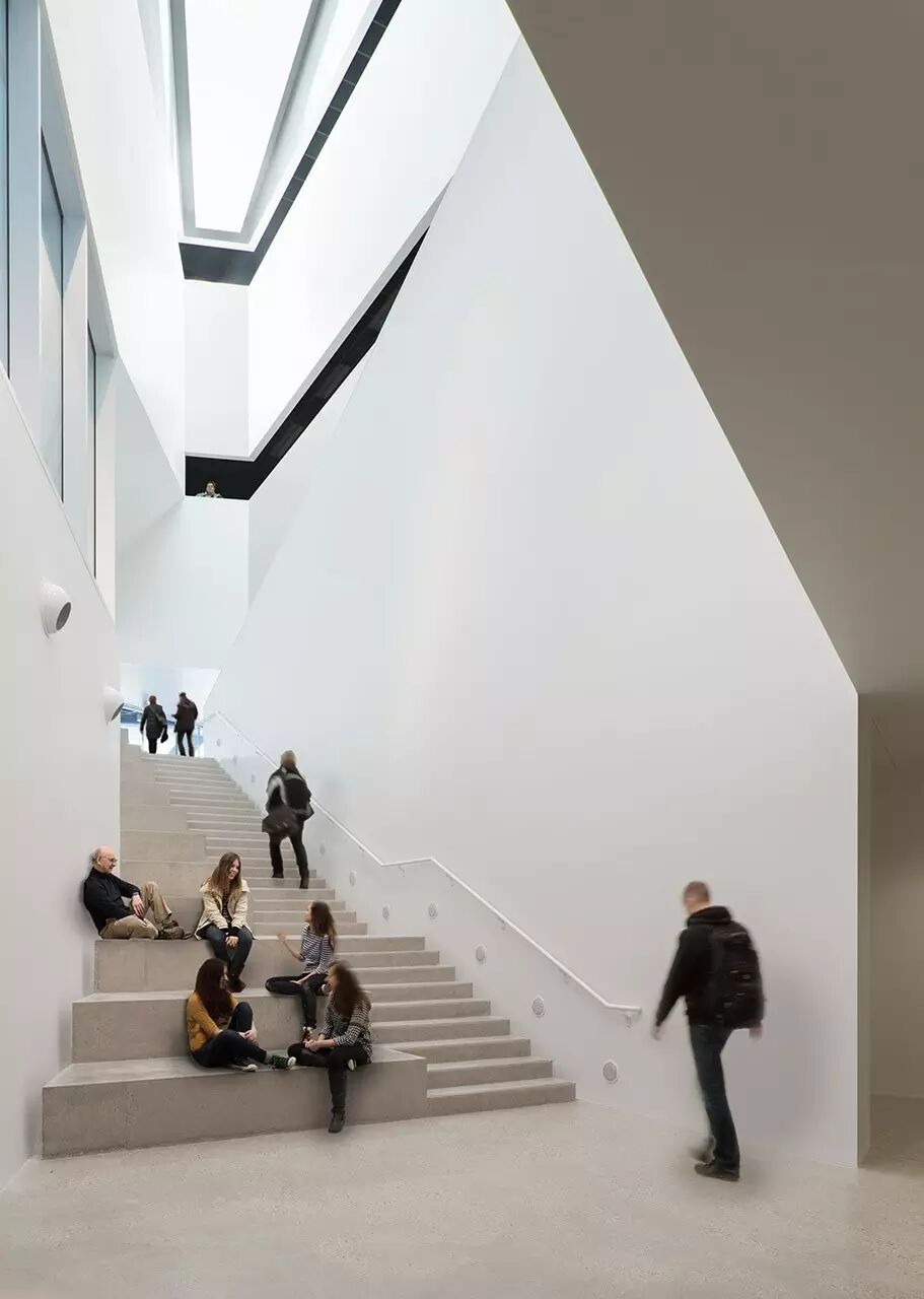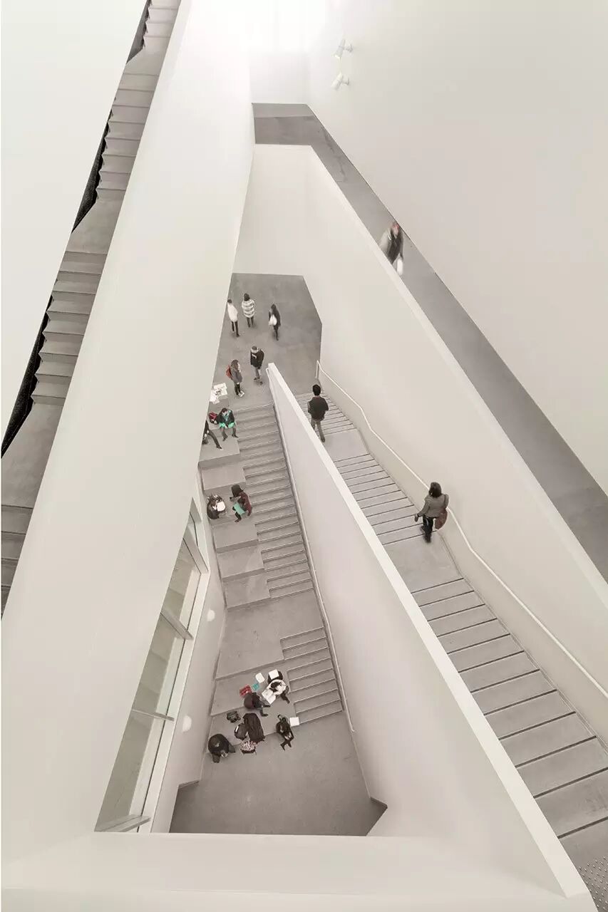 艺术学院画廊与大礼堂这两个主要的公共空间分别位于建筑的地面层及负一层空间之内。中庭空间底部顺着楼梯延伸的阶梯式座椅创造了一个层次丰富的大堂空间,将两个主要空间融入了校园地下、地面层的交通系统。教学工作室和行政办公室则位于更高的楼层,以获得更多的自然光照。