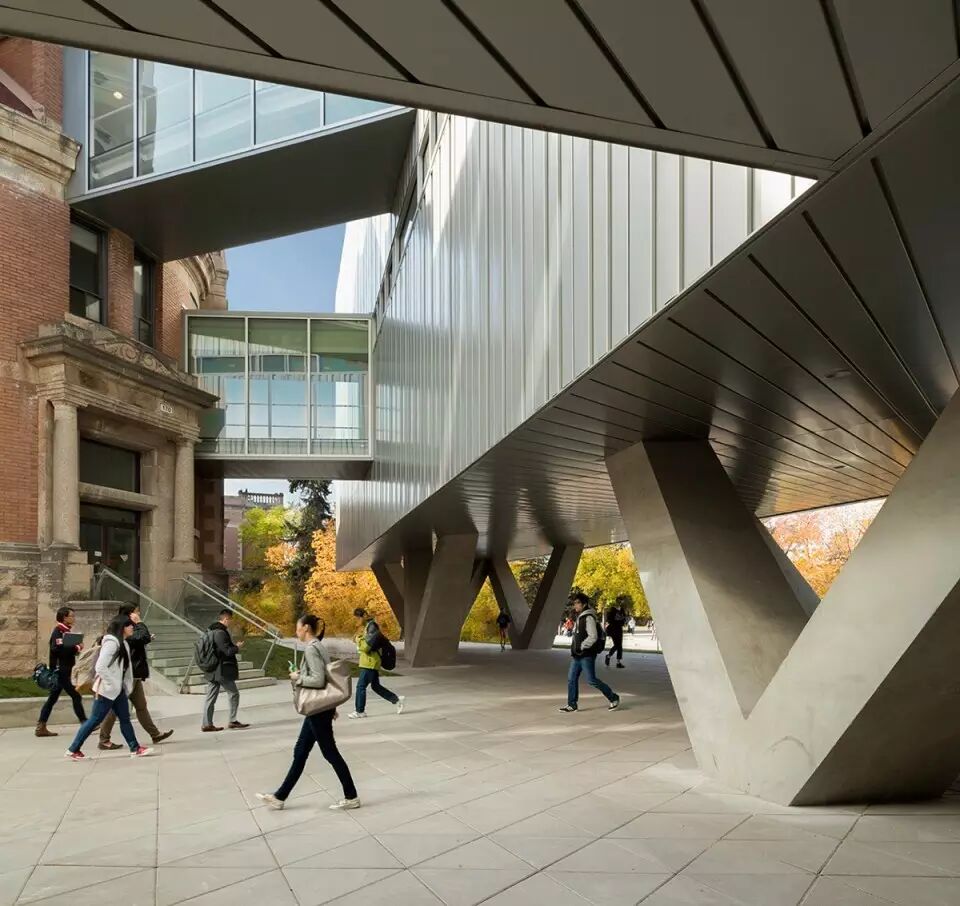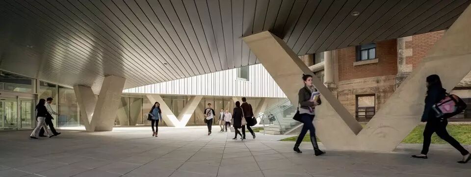 为了保证校园空间南北向的连通性,建筑师架空了建筑的北翼,将地面空间交还于行人。其下不仅形成了一个极具引导性的入口空间,同时也为校方或画廊的展览活动提供了一片不受风雨侵蚀的“户外”空间。巨大的V型柱廊在上层建筑结构与地下层空间使用中取得了平衡,在城市尺度上激活了整体空间。川流不息的行人让这片位于历史建筑与现代建筑之间的场地热闹非凡。