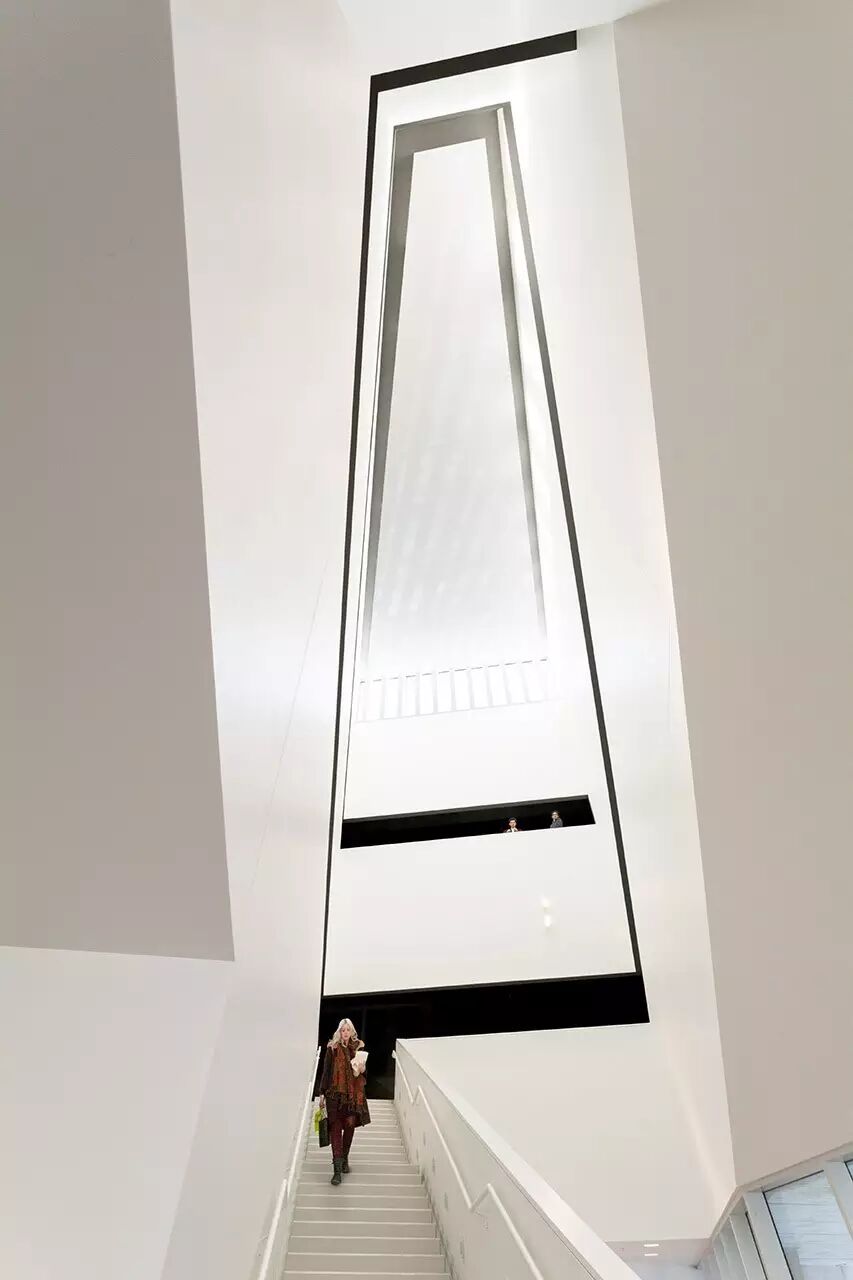 在建筑内部,一个狭长的中庭空间贯通上下,连接各层。南向阳光洒落在螺旋状的竖向交通空间中,带来温暖和光明。