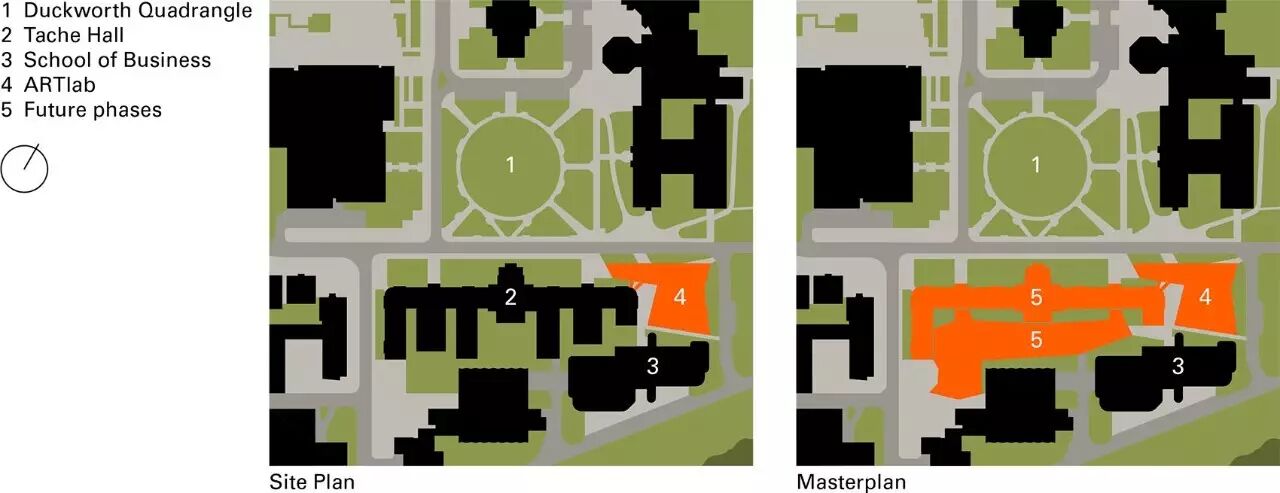 ARTlab环绕Tache Hall的北角而建,交叠的体量确保了这个艺术机构建筑空间上的整体性。向北侧延伸的建筑最大化了北向工作室空间的数量和面积, 舒展的体量从学校最主要的户外活动空间Duckworth Quadrangle侧望去一目了然。