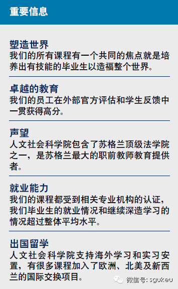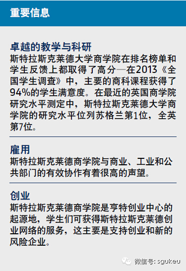 创立于1947年的斯特拉斯克莱德商学院(SBS)是一个不断进取的先驱机构,并享有国际声望。这所商学院是受到三重认证的商学院:是至2013年世界仅有的59所三重认证商学院之一,也是苏格兰唯一的一所三重认证的商学院,获得了国际机构英国工商管理硕士协会(AMBA),国际高等商学院协会(AACSB)和欧洲质量改进体系(EQUIS)的资格鉴定。我们的视野非常国际化,我们与世界各国大学长期存在的已建立的友好关系将让您有机会在国外学习一部分课程。