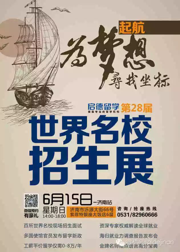启德留学第28届世界名校招生展将于本周日(6月15日)下午两点济南开幕!一起为你的梦想寻找坐标吧!