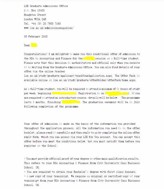 从学生的条件来看,专业背景是最大的优势。不足之处就是无雅思、Gmat成绩以及相关工作经历。因此,在文书的创造写作过程中,我多次和文案进行沟通,最终我们从重视文书的结构和整体节奏的角度来写作。与此同时,我提出了努力突出学生的学术背景和能力的想法。从而弱化了A同学在相关工作经历方面的不足以及目前缺少雅思成绩的事实。最后,该学生成功拿到了伦敦政治经济学院的会计金融专业的录取。