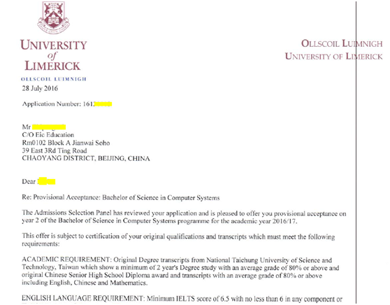 N同学,就读于台湾国立科技大学的通信工程专业。该校是台湾几所顶尖高校之一,是培养高级工程技术的学府。2016年夏,他将完成大二的学习。就在2016年6月中旬,他通过网询的方式联系启德。他还提到了在联系启德之前,他花了将近半年的时间咨询国内多家留学机构,想从台湾转学到英国或者美国。但是,没有一家机构告诉他能够为他办理此项业务。启德是他最后的希望。N同学被分配给了我。我深知这个同学的诉求将是对我的一个新的挑战。幸运的是,我又一次解决了所谓的“疑难案例”,帮助他成功转入爱尔兰的利默瑞克大学和梅努斯大学的计算机专业(见下图OFFER)。
