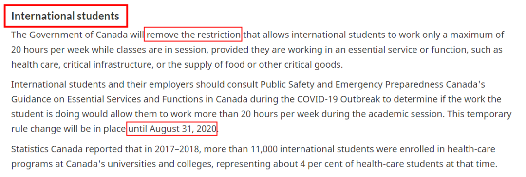 根据政府一直以来的规定,在读的留学生每周工作时间不可超过20小时,超出限制时间后果会很严重,但是由于疫情,政府宣布放宽对这项限制:若留学生从事诸如医疗、重要基建,食物或重要货品供应等必要服务(essential service),则20小时的时间限制将不再适用。所有留学生及其雇主应在疫情爆发期间查看加拿大《公共安全与应急准备》指南,以确定所从事的工作是否属于必要服务: