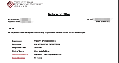 【成功案例】香港理工大学MSc MECHANICAL ENGINEERING录取