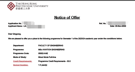 【成功案例】香港理工大学MSc AVIATION ENGINEERING录取