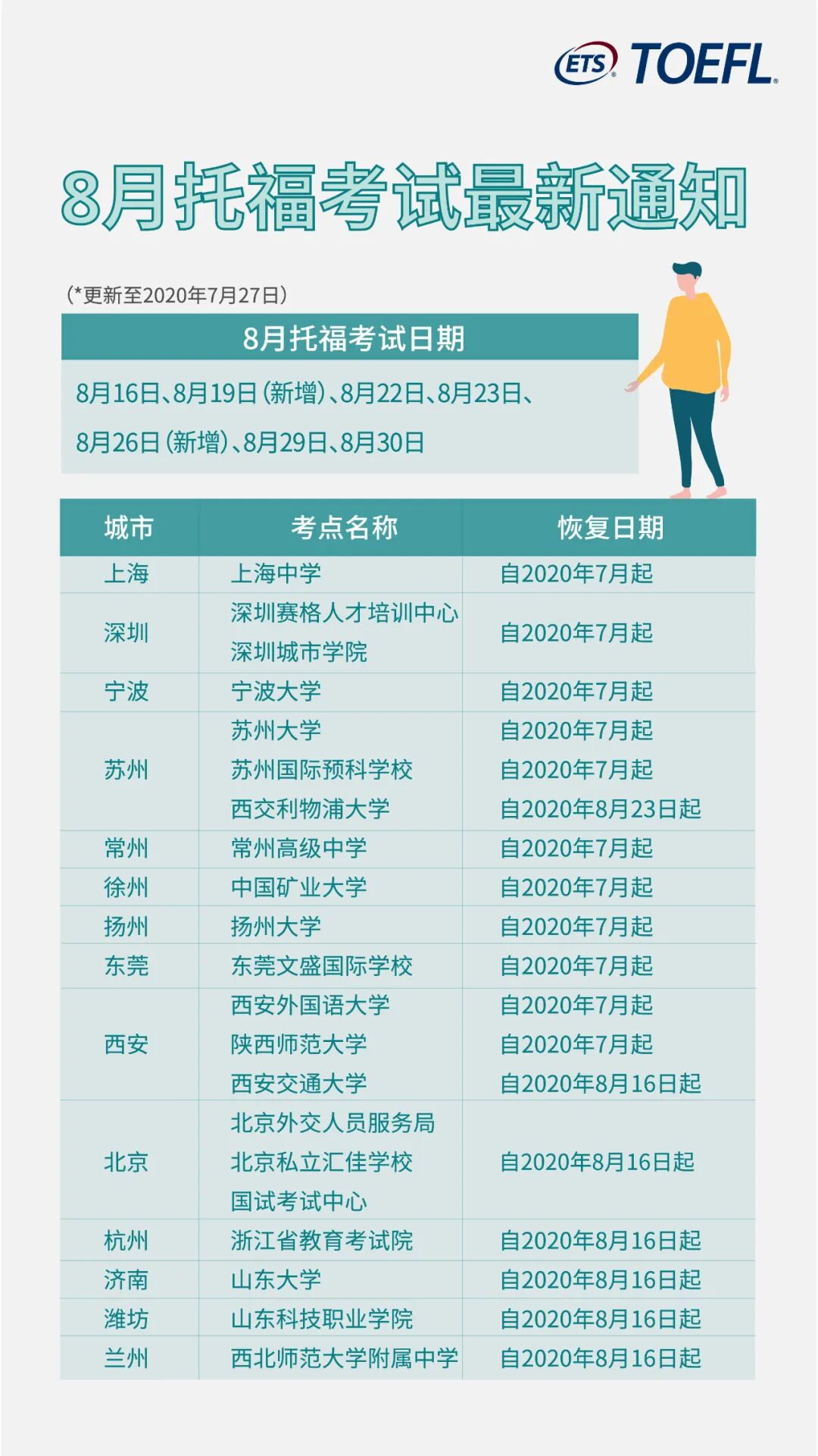 最新8月份雅思、托福、GRE、GMAT考试快讯来了!新增多个考点和场次!
