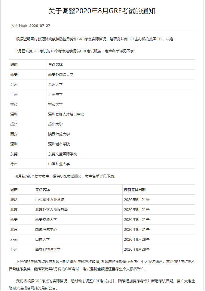 GRE8月份复考消息通知