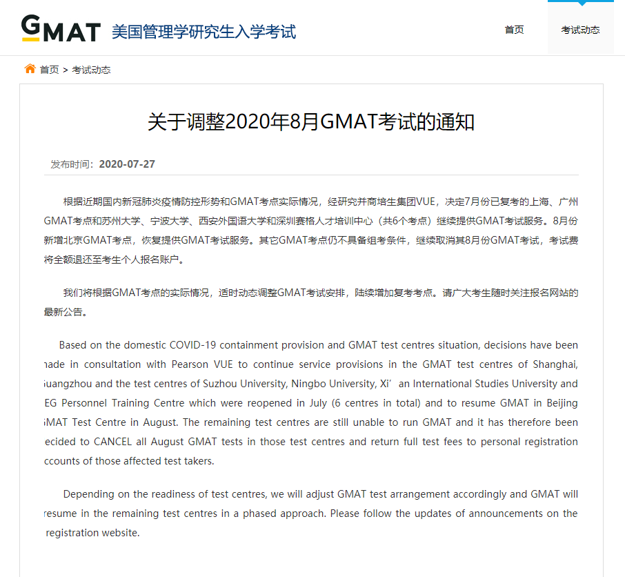 GMAT8月份复考消息通知