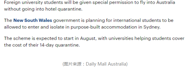 还记得之前说过的留学生返澳试点计划吗?北领地的试点计划已经顺利完成,将60多位学生带回了澳洲北领地的校园中。而近期,据Daily Mail Australia报道,澳洲最大城市悉尼所在的新南威尔士州也开始有了动作。新南威尔士州政府正在计划让留学生入境,入境的学生将集中在悉尼的专门场所进行隔离。这项留学生返澳计划预计在8月开始实行,由大学来帮学生cover14天的隔离费用。