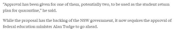 按照上次北领地的经验,留学生返澳计划需要得到联邦政府的批准。但针对这次新州的计划,联邦政府的意见是否影响到新州计划执行,目前媒体可谓是众说纷纭。有的媒体表示这个方案已经被部分approve,但仍需进一步确认。