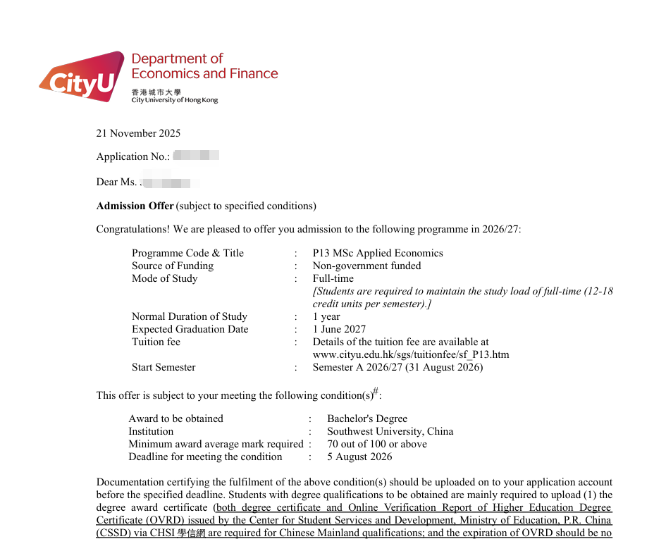 录取院校:香港城市大学 应用经济学录取