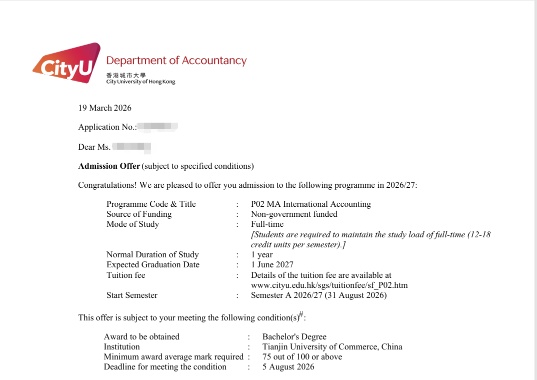 录取院校:香港城市大学 国际会计专业录取
