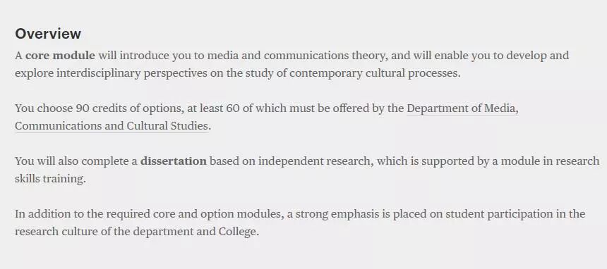基本要求:具有人文或社会科学相关专业背景,或具有媒体和传播领域专业经验的其他学位;GPA达到80分以上;2:1或同等学历的社会科学;在特殊情况下,可能会考虑只有专业经验没有学科背景的申请者;雅思总分不低于7.0,单项不低于6.5。
