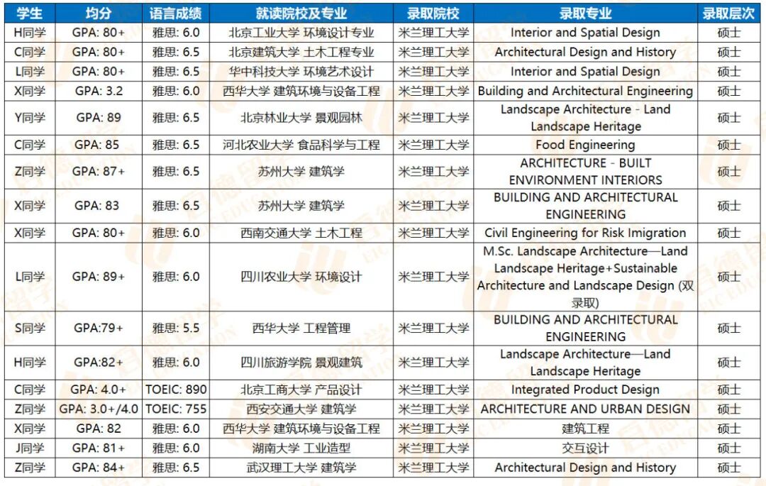 启德在申请米兰理工大学这类的顶尖理工科大学有相当的经验,申请成功率也属行业内顶尖水平。下面给大家展示一下2020年秋季部分成功案例: