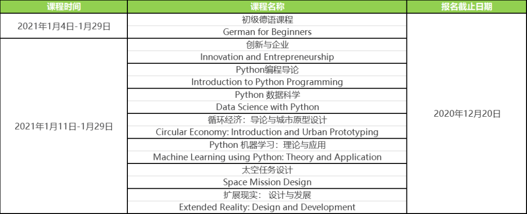 (2) 除初级德语课程外其他7门课程,课前一周即2021年1月4日-1月8日将开始为期一周的课前预备阅读周,阅读周期间学生可以自由安排学习时间,需完成约5至10小时的课前准备功课;2021年1月11日至1月29日为期三周是线上课程上课时间;