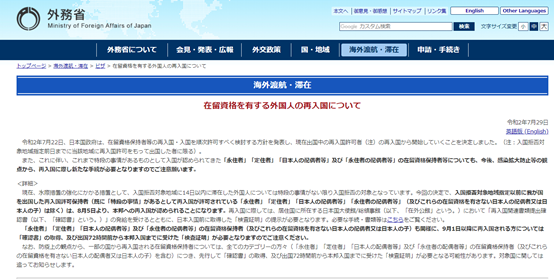 日本政府原先只允许永住者(绿卡持有者)、日本人配偶等、永住者配偶等、定住者四种人回到日本。但昨日(7月29日)新政发布,日本外务省发表公告说,允许持有日本在留资格的外国人回到日本,具体实施时间是从8月5日开始。