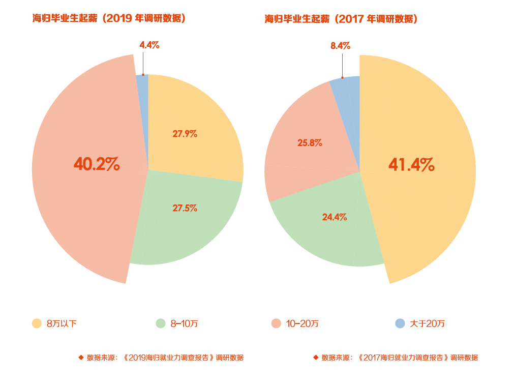 将2019 年数据横向对比2017 年海归就业年起薪分布数据发现,2017 年41 .4% 的海归年起薪小于8 万元,而到了2019 年,有40.2% 的海归起薪已经达到了10-20 万元区间,在8 万元以下区间以及8-10 万元区间分别为27.9% 以及27.5%。
