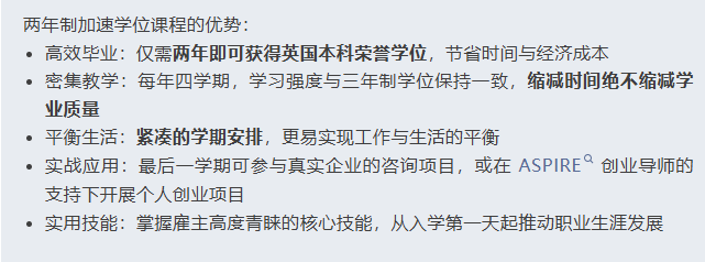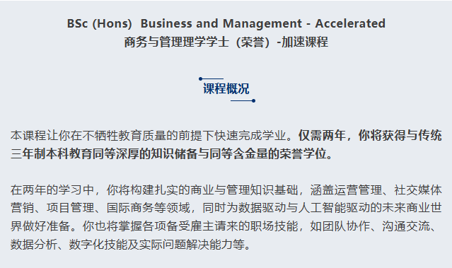 两年读完本科课程,获得英国本科荣誉学位,是本科学习的加速通道,助你高效逐梦。与传统三年制本科享有同等优质教学、相同权威认证,课程强度与知识深度完全匹配,学位认可度毋庸置疑—— 含金量绝不打折扣。