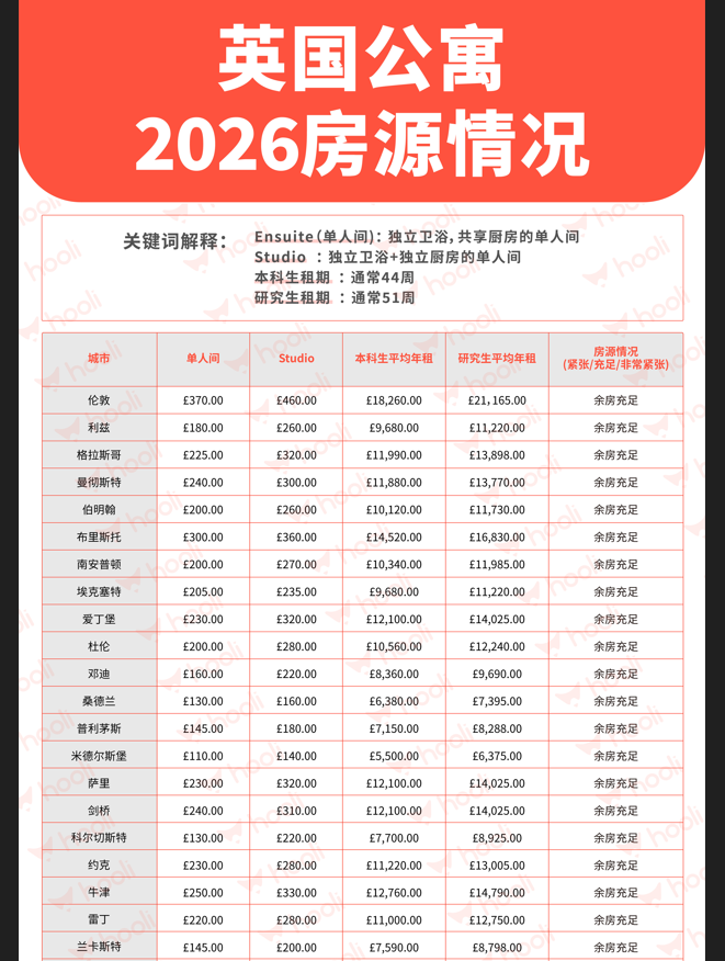 一、英国2026Fall硕士校内住宿开放名单如下:▶利兹大学▶伯明翰大学▶曼彻斯特大学二、校外留学生公寓预定信息(以hooli平台为例)一览 查看详情>>