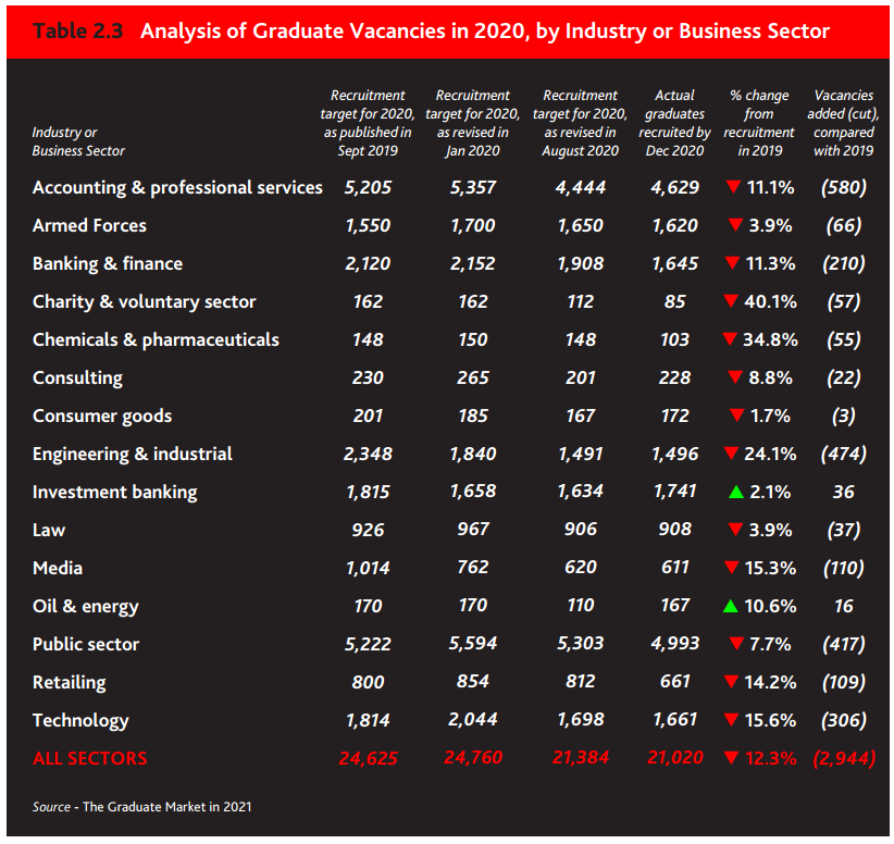 从去年进入新冠病毒全球大流行以来,持续的危机意味着全球雇主和世界经济存在相当大的不确定性,更多的公司在招聘方面表现出更大的谨慎。2020年受到疫情影响,英国主要雇主招聘的毕业生人数比计划减少了3700人,招聘人数较2019年降低12.3%,比2020年1月招聘目标低15.1%。这是自2008年全球金融危机和经济衰退以来,毕业生招聘人数下降最多的一年。在最受欢迎的15个行业和部门中,有13个出现了毕业生招聘数量下降,包括会计和专业服务公司、工程和工业公司以及公共部门雇主。而投资银行和石油能源领域有少许增幅。