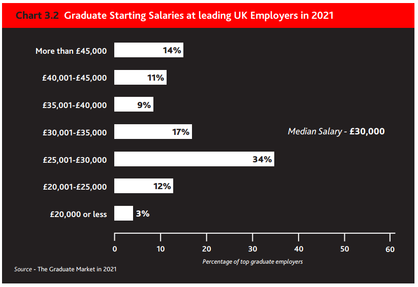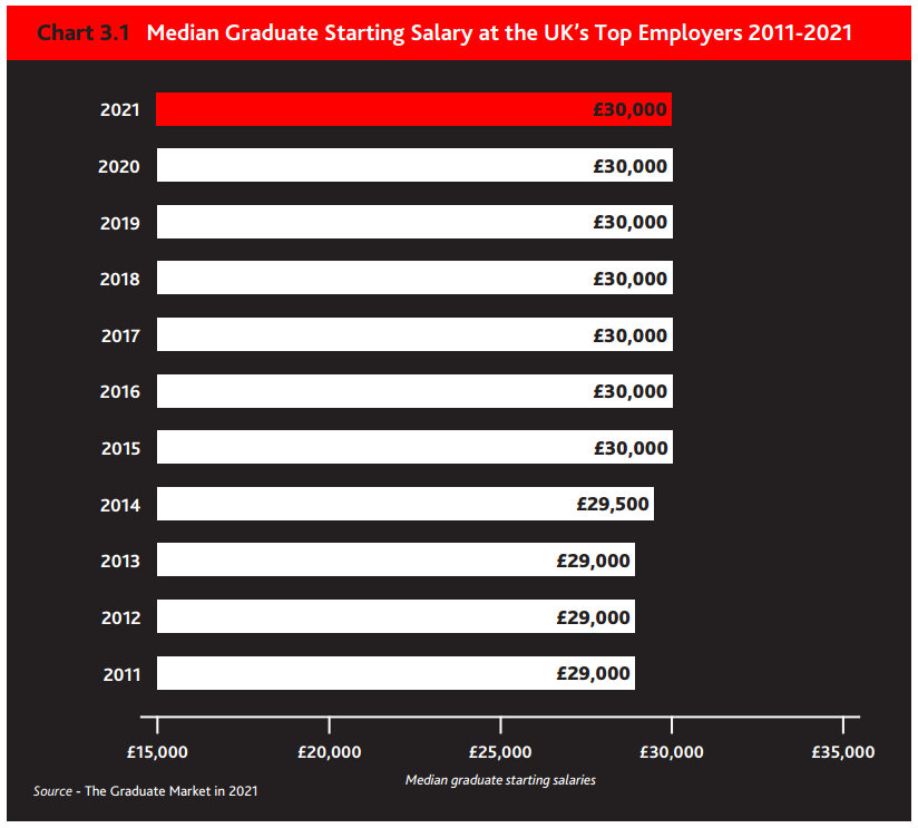 薪资方面预计英国雇主在2021年提供的毕业生起薪中位数预计为3万英镑,该数值已经连续第七年保持不变。
