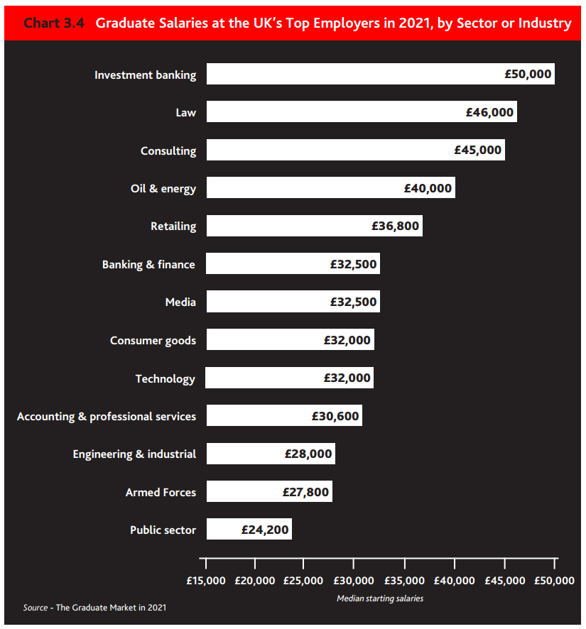 在英国就业市场中,毕业生薪酬最高的行业依旧是投资银行业,起薪中位数为5万英镑,法律专业的起薪位居第二,为4.6万英镑。咨询行业的起薪为4.5万英镑。银行与金融的起薪中位数为3.25万英镑,与2020年持平。会计与专业服务的起薪中位数为3.06万英镑,较前一年下降1.9%。
