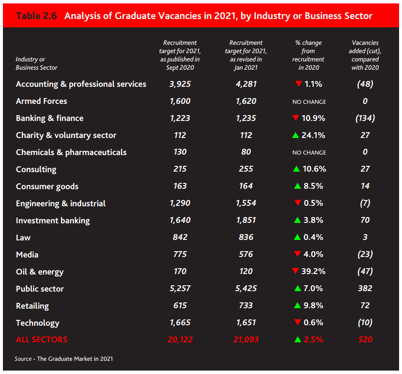尽管疫情对就业带来了不小的影响,但2021年毕业生职位空缺数量略有上升。自招聘周期开始以来,九个主要行业和商业部门的毕业生招聘目标有所增加,最明显的是会计相关行业、工程公司、投资银行和公共部门。